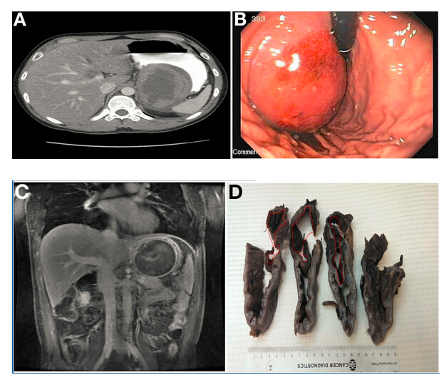 腹部磁共振成像(MRI)進(jìn)一步明確為界限清楚、不均質(zhì)腫塊,對(duì)比增強(qiáng)(圖C),提高了對(duì)胃腸道間質(zhì)瘤(GIST)的懷疑。計(jì)劃手術(shù)切除。