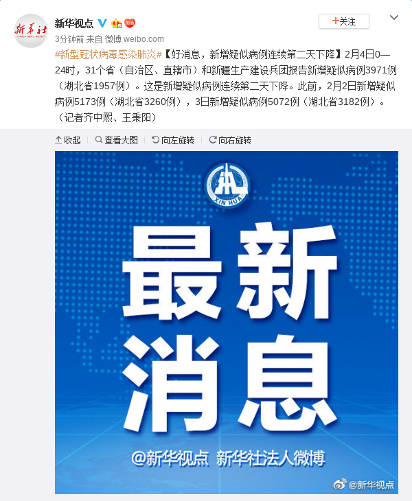 2月4日0—24時,31個?。ㄗ灾螀^(qū)、直轄市)和新疆生產建設兵團報告新增疑似病例3971例(湖北省1957例)。這是新增疑似病例連續(xù)第二天下降。此前,2月2日新增疑似病例5173例(湖北省3260例),3日新增疑似病例5072例(湖北省3182例)。(記者齊中熙、王秉陽)