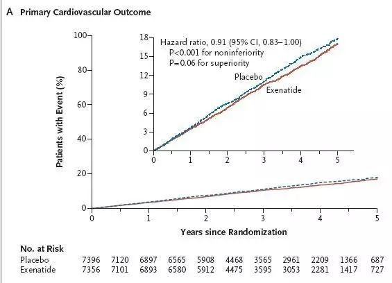 EXSCEL研究共入選全球35家中心的14752例患者,73.1%既往有心血管疾病病史,HbA1c水平在6.5%至10%之間,將患者分為艾塞那肽周制劑組(7356例)及對照組(7396例)。中位隨訪時間3.2年。結(jié)果顯示,艾塞那肽組主要復(fù)合終點事件發(fā)生839/7356例(3.7例/100人-年),對照組發(fā)生905/7396例(4例/100人-年),HR為0.91(95%CI 0.83~1.00)。在安全性方面,艾塞那肽周制劑非劣效于安慰劑(P<0.001),在有效性方面,也不優(yōu)于安慰劑組(P=0.06)。兩組間的心血管死亡、致死性或非致死性心肌梗死、致死性或非致死性卒中、心衰住院、急性冠脈綜合征住院、急性胰腺炎、胰腺癌、甲狀腺髓樣癌及其他不良反應(yīng)沒有顯著差別。